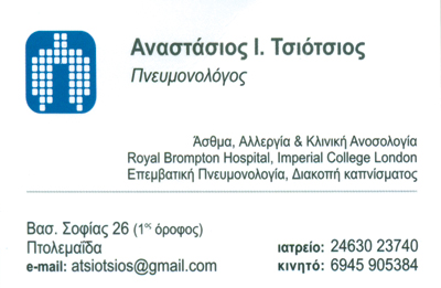 customer tabsΕπικοινωνίαΠνευμολογός - ΦυματιολόγοςΔέχεται καθημερινά πρωί 09:00-13:30, απόγευμα 17:00-20:00Πνευμονολόγοι - ΦυματιολόγοιΥγείαΒασ. Σοφίας 26, Πτολεμαϊδα, ΚοζάνηΠΤΟΛΕΜΑΪΔΑ ΚΟΖΑΝΗΣΚΟΖΑΝΗΜΑΚΕΔΟΝΙΑ 2463023740 6945905384atsiotsios@gmail.com Το προτείνω (έχει προταθεί 0 φορές) ΦωτογραφίεςFacebook LikeShare on FacebookTweet Widget