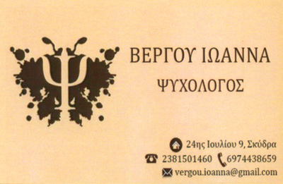 customer tabsΕπικοινωνίαΆγχος Κατάθλιψη, Στρές, Φοβίες, Πανικός Συμβουλευτική Γονέων,Παιδιών και ΕνηλίκωνΚαθημερινά με ΡαντεβούΨυχολόγοιΥγεία24ης Ιουλίου 9, Σκύδρα, ΠέλλαΣΚΥΔΡΑ ΠΕΛΛΑΣΠΕΛΛΑΜΑΚΕΔΟΝΙΑ 2381501460vergou.ioanna@gmail.com Το προτείνω (έχει προταθεί 0 φορές) ΦωτογραφίεςFacebook LikeShare on FacebookTweet Widget