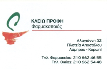 customer tabsΕπικοινωνίαΣυμπληρώματα Διατροφής, Είδη ΒΕΒΕ, Καλλυντικά, Παιδική Φροντίδα, Ομοιπαθητικά, ΟρθοπεδικάΦαρμακείαΥγείαΑλαγιάννη 32, Κορωπί, ΑττικήΚΟΡΩΠΙ ΑΤΤΙΚΗΣΑΤΤΙΚΗΣΤΕΡΕΑ ΕΛΛΑΔΑ 2106624655kleioprofi@yahoo.it Το προτείνω (έχει προταθεί 0 φορές) ΦωτογραφίεςFacebook LikeShare on FacebookTweet Widget