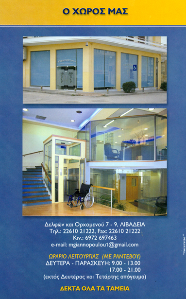 customer tabsΕπικοινωνίαΑθλητικές κακώσεις, Ρευματολογικές Παθήσεις, Παθήσεις Σπονδυλικής ΣτήληςΘεραπείες κατ'οίκον, Σύμβαση ΕΟΠΥΥΦυσικοθεραπευτέςΥγείαΔελφών και Ορχομενού 7-9, ΛιβαδειάΛΙΒΑΔΕΙΑ ΒΟΙΩΤΙΑΣΒΟΙΩΤΙΑΣΤΕΡΕΑ ΕΛΛΑΔΑ 2261021222 69726974632261021222mgiannopoulou1@gmail.com Το προτείνω (έχει προταθεί 0 φορές) ΦωτογραφίεςFacebook LikeShare on FacebookTweet Widget