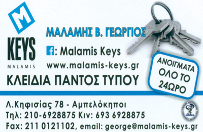 customer tabsΕπικοινωνίαΚλειδιά πάντος τύπου.Κλειδιά και ΚλειδαριέςΛοιπάΛεωφόρος Κηφησίας 78, Αθήνα, ΑττικήΑΘΗΝΑ ΑΤΤΙΚΗΣΑΤΤΙΚΗΣΤΕΡΕΑ ΕΛΛΑΔΑ 2106928875 6936928875george@malamis-keys.grwww.malamis-keys.grMalamis Keys Το προτείνω (έχει προταθεί 0 φορές) ΦωτογραφίεςFacebook LikeShare on FacebookTweet Widget
