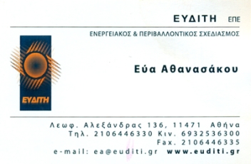 customer tabsΕπικοινωνίαΗ εταιρεία Ευδίτη διενεργεί μελέτες και παρέχει συμβουλευτικές υπηρεσίεςμε βασικό αντικείμενο την εξοικονόμηση ενέργειας και την προστασία των φυσικών πόρων.Διαθέτοντας εκτενή γνώση, και εμπειρία σε ενεργειακά επενδυτικά έργα,παρέχει αξιόπιστες και ολοκληρωμένες υπηρεσίες σε επενδυτές, με κύριο άξονα την απόδοση των επενδύσεων.Η Ευδίτη, διαθέτει ένα ευρύ δίκτυο εξειδικευμένων συνεργατών και μπορεί να προσφέρει ολοκληρωμένες υπηρεσίες και λύσεις,ακόμη και στα πιο απαιτητικά έργα οπουδήποτε στον κόσμο.Πραγματοποιεί Θερμογράφηση κτιρίων εξωτερικά και εσωτερικά για τον εντοπισμό προβληματικών περιοχών, εστιών υγρασίας κ.λπ.Έχει εκτεταμένη εμπειρία στον σχεδιασμό και την ανάπτηξη Υβριδκών Συστημάτων ΑΠΕ στους τομείς των τηλεπικοινωνιών και ηλεκτροδότησης.Αναλαμβάνει την εκπόνηση μελετών,εξασφαλίζοντας εξοικονόμηση ενέργειας, βιοκλιματικό σχεδιασμό και θερμική άνεση.Πανελλαδική εξυπηρέτησηΑνανεώσιμες Πηγές Ενέργειας και Ορθολογική ΧρήσηΕξοικονόμηση ΕνέργειαςΦωτοβολταϊκάΝερό - Μηχανήματα Επεξεργασίας και ΚαθαρισμούΛοιπάΔόμηση - ΚατοικίαΛεωφόρος Αλεξάνδρας 136, Αμπελόκηποι, ΑττικήΑΜΠΕΛΟΚΗΠΟΙ ΑΤΤΙΚΗΣΑΤΤΙΚΗΣΤΕΡΕΑ ΕΛΛΑΔΑ 21064463302106446330info@euditi.greuditi.grEuditi LTD Το προτείνω (έχει προταθεί 0 φορές) ΦωτογραφίεςFacebook LikeShare on FacebookTweet Widget