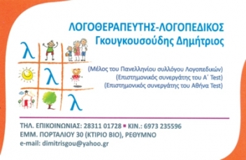 customer tabsΕπικοινωνίαΛογοπεδικοί - ΛογοθεραπευτέςΥγείαΕμμανουήλ Πορτάλιου 30, ΡέθυμνοΡΕΘΥΜΝΟ ΡΕΘΥΜΝΟΥΡΕΘΥΜΝΟΚΡΗΤΗ 2831401728 6973235596dimitrisgou@yahoo.gr Το προτείνω (έχει προταθεί 0 φορές) ΦωτογραφίεςFacebook LikeShare on FacebookTweet Widget