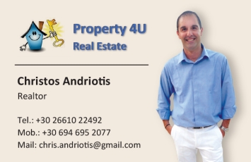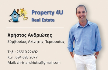 customer tabsΕπικοινωνίαΈχοντας ως βασικές μας αρχές το σεβασμό και τη συνέπεια,έχουμε θέσει ως στόχο και προτεραιότητά μαςτην καλύτερη δυνατή εξυπηρέτηση των αναγκών σας.Λειτουργώντας με υπευθυνότητα & επαγγελματισμό,θα φροντίσουμε μαζί με το δίκτυο των έμπειρων συνεργατών μας(μηχανικό, τοπογράφο), να σας παρέχουμε αξιόπιστεςσυμβουλές και να σας καθοδηγήσουμε, προτείνοντάς σαςιδέες για την πώληση ή την αγορά του ακινήτου σας.Εάν έχετε ακίνητο προς πώληση:επικοινωνήστε μαζί μας για να σας ενημερώσουμε για τους τρόπους προβολής & προώθησης του ακινήτου σας στο δίκτυό μας στην Ελλάδα και στο εξωτερικό. Εάν ενδιαφέρεστε να επενδύσετε στην αγορά ακινήτου:επικοινωνήστε μαζί μας για να καταγράψουμε τις ανάγκες σαςκαι να σας βοηθήσουμε να βρείτε το ιδανικό ακίνητο για εσάς. Σκοπός μας είναι η δική σας εξυπηρέτηση. Μεσιτικά Γραφεία - ΚτηματομεσίτεςΔόμηση - ΚατοικίαΥπηρεσίεςΕθνική Οδός Αχιλλείου 70, ΚέρκυραΚΕΡΚΥΡΑΝΗΣΙΑ ΙΟΝΙΟΥ ΠΕΛΑΓΟΥΣ 6946952077chris.andriotis@gmail.cominfo@property-4u.grwww.property-4u.grProperty 4U Το προτείνω (έχει προταθεί 0 φορές) ΦωτογραφίεςFacebook LikeShare on FacebookTweet Widget
