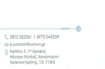 customer tabsΕπικοινωνίαΔευτέρα & Παρασκευή: 09:00 - 13:00Τρίτη, Τετάρτη & Πέμπτη: 17:30 - 21:00κατόπιν ραντεβούΧειρουργοί ΟδοντίατροιΥγείαΕφόδου 3, Μέγαρο Χανδαξ (1ος όροφος), ΗράκλειοΗΡΑΚΛΕΙΟ ΗΡΑΚΛΕΙΟΥΗΡΑΚΛΕΙΟΚΡΗΤΗ 2810262261 6973045259p.parasiri@yahoo.gr Το προτείνω (έχει προταθεί 0 φορές) ΦωτογραφίεςFacebook LikeShare on FacebookTweet Widget