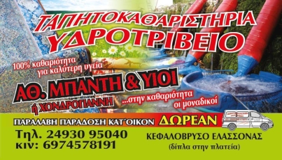 customer tabsΕπικοινωνίαΚαθαρισμός και φύλαξη πάντος είδους χαλιά, μοκέτες, φλοκάτες,παπλώματα, κουβέρτες.Εξυπηρετούμε καθημερινά (και Σάββατο) 08:00 - 20:00,σε όλη τη Λάρισα.Καθαρισμός και Φύλαξη Χαλιών Μοκετών και ΤαπήτωνΥπηρεσίεςΚεφαλόβρυσο, Ελασσόνα, ΛάρισαΕΛΑΣΣΟΝΑ ΛΑΡΙΣΑΣΛΑΡΙΣΑΘΕΣΣΑΛΙΑ 2493095040 6974578191vangelischon@yahoo.comΧονδρογιάννης Αθανάσιος Ταπητοκαθαριστήρια υδροτριβείοΤαπητοκαθαριστήρια Αθ. Μπαντή κ Υιοί Το προτείνω (έχει προταθεί 0 φορές) ΦωτογραφίεςFacebook LikeShare on FacebookTweet Widget