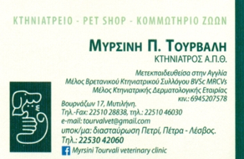 customer tabsΕπικοινωνίαΔέχεται Δευτέρα - Σάββατο 08:30 - 14:00 & 17:30 - 19:30,εκτός Τετάρτης και Σαββάτου απογεύματοςΥποκατάστημα: Διασταύρωση Πέτρας, ΜυτιλήνηΔευτέρα & Πέμπτη 10:00 - 14:00Κτηνιατρεία και Κτηνιατρικές ΚλινικέςΚτηνιατρικά Είδη - Εργαλεία και ΦάρμακαΥγείαΒουρνάζων 17, ΜυτιλήνηΜΥΤΙΛΗΝΗ ΛΕΣΒΟΥΛΕΣΒΟΣΝΗΣΙΑ ΑΙΓΑΙΟΥ ΠΕΛΑΓΟΥΣ 2251028838 2253042060 6945207578tourvalvet@gmail.comMyrsini Tourvali veterinary clinic Το προτείνω (έχει προταθεί 0 φορές) ΦωτογραφίεςFacebook LikeShare on FacebookTweet Widget