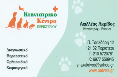 customer tabsΕπικοινωνίαΤο Κτηνιατρικό Κέντρο Περιστερίου ιδρύθηκε το 1993.Προσφέρει φροντίδα και ολοκληρωμένη θεραπεία σε σκύλους,γάτες καθώς και σε όλα τα άλλα κατοικίδια συμπεριλαμβανομένων κουνελιών,ινδικών χοιριδίων, χάμστερ, feret, παπαγάλων και άλλων πτηνώνκαθώς και σε σαύρες (ιγκουάνες, δράκοι). Μεταμορφωθήκαμε σε μια εντυπωσιακή και άνετη κλινική στοκέντρο του Περιστερίου, με δικό της πάρκινγκ και με ομάδα ειδικευμένωνκαι έμπειρων γιατρών που είναι έτοιμοι να διευθετήσουν σχεδόνκάθε πρόβλημα των μικρών σας φίλων. Στο Κτηνιατρικό Κέντρο Περιστερίου υπάρχει η δυνατότητα διαχείρησηςκάθε παθολογικού και χειρουργικού περιστατικού.Πέραν όμως από τις βασικές κτηνιατρικές υπηρεσίες, έχουν δομηθεί εξειδικευμένατμήματα που μπορούν να καλύψουν τα πλέον απαιτητικά περιστατικά. Κτηνιατρεία και Κτηνιατρικές ΚλινικέςΥγείαΛεωφόρος Παναγή Τσαλδάρη 12, Περιστέρι, ΑττικήΠΕΡΙΣΤΕΡΙ ΑΤΤΙΚΗΣΑΤΤΙΚΗΣΤΕΡΕΑ ΕΛΛΑΔΑ 2105720761 6977558945axakrivos@yahoo.grwww.petvets.gr Το προτείνω (έχει προταθεί 0 φορές) ΦωτογραφίεςFacebook LikeShare on FacebookTweet Widget