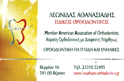 customer tabsΕπικοινωνίαΟρθοδοντικοίΥγείαΒερμίου 16, ΒέροιαΒΕΡΟΙΑ ΗΜΑΘΙΑΣΗΜΑΘΙΑΜΑΚΕΔΟΝΙΑ 2331022495 6977529605www.leoathans1453.wixsite.com/orthodontics Το προτείνω (έχει προταθεί 0 φορές) ΦωτογραφίεςFacebook LikeShare on FacebookTweet Widget