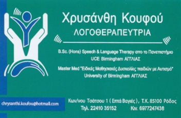 customer tabsΕπικοινωνίαΛογοπεδικοί - ΛογοθεραπευτέςΥγείαΚωνσταντίνου Τσάτσου 1, ΡόδοςΡΟΔΟΣ ΔΩΔΕΚΑΝΗΣΟΥΔΩΔΕΚΑΝΗΣΑΝΗΣΙΑ ΑΙΓΑΙΟΥ ΠΕΛΑΓΟΥΣ 2241035152 6977247438chrysanthi.k82@hotmail.comchrysanthi.koufou@hotmail.com Το προτείνω (έχει προταθεί 0 φορές) ΦωτογραφίεςFacebook LikeShare on FacebookTweet Widget
