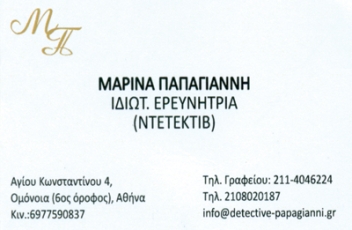customer tabsΕπικοινωνίαΤο γραφείο ιδιωτικών ερευνών Μ. Παπαγιάννη για την καλύτερηδυνατή διευκόλυνση των πελατών και την επίλυση των υποθέσεών τους,βρίσκεται σε συνεχή συνεργασία με διακεκριμένουςκαι καταρτισμένους νομικούς, ψυχολόγους και γενετιστές.Αναλαμβάνει:Προγαμιαίες έρευνεςΕνδοοικογενειακές έρευνεςΕπιτήρηση ανηλίκων για ναρκωτικά, παραβατική συμπεριφορά, παραθρησκευτικές οργανώσεις, μαγεία, πορνείαΚληρονομικές υποθέσειςΤαυτοποιήσεις DNAΕπαγγελματικές έρευνες, εμπορικές και βιομηχανικέςΑνεύρεση κλοπιμαίωνΝαυτιλιακές έρευνεςΈρευνες κινητής και ακίνητης ιδιοκτησίαςΦορολογικές έρευνεςΕξακρίβωση υποθέσεων που αφορούν υπουργεία, οργανισμούς και τράπεζεςΑνεύρεση παντός είδους χρεοφειλετώνΕντοπισμός απολεσθέντων ατόμωνΠρόληψη απαγωγώνΠροστασία προσώπων και χώρωνΦθορά ιδιοκτησίαςΕξιχνίαση εγκλημάτωνΣυνεργασία με τα Μ.Μ.Ε. για έρευνες σχετικές με αστυνομικά ρεπορτάζΕντοπισμός στοιχείων για δικαστική έρευναΣυλλογή απόρρητων πληροφοριών και εγγράφωνΑναζήτηση μαρτύρωνΕιδικές φωτογραφίσεις και παρακολουθήσειςΕντοπισμός απόρρητων τηλεφωνημάτωνΤαυτοποίηση ανώνυμων αποστολέωνΕξακρίβωση διεύθυνσηςΠροστασία από υποκλοπέςΕντοπισμός μέσω GPSΕντοπισμός κινητού τηλεφώνου και ηλεκτρονικού υπολογιστήΠροστασία των δεδομένων της κάρτας SIM κινητού τηλεφώνου και ηλεκτρονικού υπολογιστήΑνάκτηση κωδικών τηλεφώνου και ηλεκτρονικού υπολογιστήΟ πελάτης ενημερώνεται σε κάθε στάδιο των εργασιών για την εξέλιξη της υπόθεσής του.Η αμοιβή δίδεται κατόπιν ολοκλήρωσης διεξαγωγής της υπόθεσης.Γραφεία Ιδιωτικών ΕρευνώνΥπηρεσίεςΑγίου Κωνσταντίνου 4, ΑθήναΑΘΗΝΑ ΑΤΤΙΚΗΣΑΤΤΙΚΗΣΤΕΡΕΑ ΕΛΛΑΔΑ 2108020187 2114046224 6977590837info@detective-papagianni.grwww.detective-papagianni.grΠαπαγιάννη Ντετέκτιβ Το προτείνω (έχει προταθεί 0 φορές) ΦωτογραφίεςFacebook LikeShare on FacebookTweet Widget