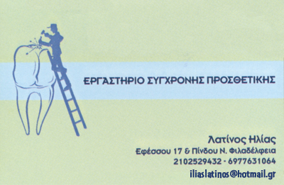 customer tabsΕπικοινωνίαΟδοντοτεχνίτες και Οδοντοτεχνικά ΕργαστήριαΥγείαΕφέσου 17 & Πίνδου, Νέα ΦιλαδέλφειαΝΕΑ ΦΙΛΑΔΕΛΦΕΙΑ ΑΤΤΙΚΗΣΑΤΤΙΚΗΣΤΕΡΕΑ ΕΛΛΑΔΑ 2102529432 6977631064iliaslatinos@hotmail.gr Το προτείνω (έχει προταθεί 0 φορές) ΦωτογραφίεςFacebook LikeShare on FacebookTweet Widget