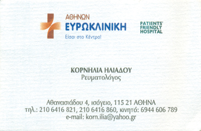 customer tabsΕπικοινωνίαΩράριο ιατρείου:Τρίτη 09:30 - 13:30 & 18:30 - 21:00Ωράριο Ευρωκλινικής:Κάθε Τετάρτη κατόπιν ραντεβούΡευματολόγοιΥγεία2ας Μαϊου 4, Νέα ΣμύρνηΝΕΑ ΣΜΥΡΝΗ ΑΤΤΙΚΗΣΑΤΤΙΚΗΣΤΕΡΕΑ ΕΛΛΑΔΑ 2109319840 2106416860 - Κλινική 6944606789korni.ilia@yahoo.gr Το προτείνω (έχει προταθεί 0 φορές) ΦωτογραφίεςFacebook LikeShare on FacebookTweet Widget