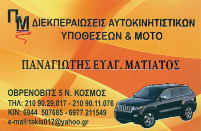 customer tabsΕπικοινωνίαΜετά την 25ετή εμπειρία μας στο χώρο του αυτοκινήτου, της μοτοσυκλέτας και φορτηγών, είμαστε σίγουροι ότι σε εμάς θα βρείτε εμπιστοσύνη, εχεμύθεια, γρήγορη εξυπηρέτηση και με χαμηλό κόστος παροχής υπηρεσιών.Το γραφείο μας εξυπηρετεί εταιρείες και ιδιώτες σε όλο το λεκανοπέδιο της Αττικής. Με το δυναμικό προσωπικό που έχουμε ερχόμαστε στην έδρα σας.Έχοντας γνώση την κρίση που περνάει ο κλάδος του αυτοκινήτου και της μοτοσυκλέτας, προσπαθούμε και εμείς με τον τρόπο μας να κατεβάσουμε τις τιμές, ώστε να μην υπάρχει μεγάλο κόστος αμοιβής για τις ταξινομήσεις και μεταβιβάσεις των αυτοκινήτων και μοτοσυκλετών.Μερικές απ τις υπηρεσίες που προσφέρουμε:Κ.Τ.Ε.Ο. ΕΙΧ & ΜοτοΜεταβιβάσεις ΕΙΧ & ΜοτοΕξαγωγές ΕΙΧ & ΜοτοΑλλαγές ΚινητήρωνΑντικατάσταση ΠινακίδωνΆδειες ΤρέϊλερΚληρονομικάΔιεκπεραιώσεις ΕΛΠΑ Μεταβιβάσεις ΟχημάτωνΤεχνικός Έλεγχος Αυτοκινήτων (ΚΤΕΟ)Διεκπεραιώσεις Αυτοκινητιστικών ΥποθέσεωνAUTO - MOTOΥπηρεσίεςΟβρένοβιτς 5, Νέος Κόσμος, ΑττικήΑΘΗΝΑ ΑΤΤΙΚΗΣΝΕΟΣ ΚΟΣΜΟΣ ΑΘΗΝΩΝΔΑΦΝΗ ΑΤΤΙΚΗΣΝΕΑ ΣΜΥΡΝΗ ΑΤΤΙΚΗΣΚΑΛΛΙΘΕΑ ΑΤΤΙΚΗΣΑΤΤΙΚΗΣΤΕΡΕΑ ΕΛΛΑΔΑ 2109029817 6944507685takis012@yahoo.grwww.matiatos-panos.gr Το προτείνω (έχει προταθεί 1 φορές) ΦωτογραφίεςFacebook LikeShare on FacebookTweet Widget