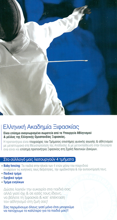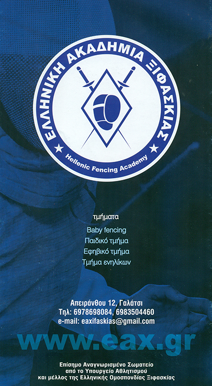 customer tabsΕπικοινωνίαΑθλητικά Κέντρα και ΣχολέςΕκπαίδευσηΑπειράνθου 12 & Πλάτωνος, ΓαλάτσιΓΑΛΑΤΣΙ ΑΤΤΙΚΗΣΑΤΤΙΚΗΣΤΕΡΕΑ ΕΛΛΑΔΑ 6978698084eaxifaskias@gmail.comwww.eax.grΕλληνική Ακαδημία Ξιφασκίας - Γαλάτσι Το προτείνω (έχει προταθεί 1 φορές) ΦωτογραφίεςFacebook LikeShare on FacebookTweet Widget