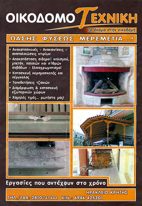customer tabsΕπικοινωνίαΑνακατασκευές - Ανακαινίσεις, αναπαλαιώσεις κτιρίωνΑποκατάσταση σιδήρου οπλισμού, μπετόν, παλαιών και σαθρών σοβάδων, - ελαιοχρωματισμοίΚατασκευή κεραμοσκεπής και πέργκολαςΤοποθετήσεις τζακιώνΔιαμόρθωση και κατασκευή εξωτερικών χώρωνΧαμηλές τιμές...ρωτήστε μας!Εργασίες που αντέχουν στο χρόνο. Οικοδομικές Επιχειρήσεις και ΕργασίεςΘερμοπροσόψειςΜονωτικές και Στεγανωτικές ΕργασίεςΑνακαίνιση - Αναπαλαίωση ΚτιρίωνΚεραμοσκεπέςΤζάκιαΠέργκολεςΔόμηση - ΚατοικίαΠεζά, ΗράκλειοΗΡΑΚΛΕΙΟ ΗΡΑΚΛΕΙΟΥΗΡΑΚΛΕΙΟΚΡΗΤΗ 2810741444 69464253012810741444mperkik@yahoo.gr Το προτείνω (έχει προταθεί 0 φορές) ΦωτογραφίεςFacebook LikeShare on FacebookTweet Widget