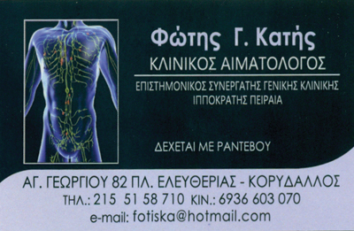 customer tabsΕπικοινωνίαΚλινικός αιματολόγοςΩράριο:Δευτλερα - Παρασκευή 08:00 - 13:00 & 17:00 - 21:00ΑιματολόγοιΥγείαΑγίου Γεωργίου 82, ΚορυδαλλόςΚΟΡΥΔΑΛΛΟΣ ΑΤΤΙΚΗΣΑΤΤΙΚΗΣΤΕΡΕΑ ΕΛΛΑΔΑ 2155158710 6936603070fotiska@hotmail.com Το προτείνω (έχει προταθεί 0 φορές) ΦωτογραφίεςFacebook LikeShare on FacebookTweet Widget
