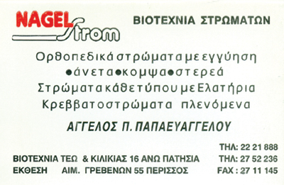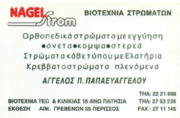 customer tabsΕπικοινωνίαΤα στρώματα της Nagel Strom σάς ανοίγουν την καρδιά τους!Ορθοπαιδικά στρώματα: Κατά κύριο λόγο, τα ορθοπαιδικά στρώματααποτελούνται από ελατήρια συνδεδεμένα μεταξύ τους τα οποία ονομάζουμε Bonnel Springs.Έτσι, επιτυγχάνουμε την καλή υποστήριξη της σπονδυλικής στήλης,προκειμένου να μην κυρτώνει κατά τη διάρκεια του ύπνου.Ανατομικά στρώματα: Κατά κύριο λόγο, τα ανατομικά στρώματααποτελούνται από ανεξάρτητα ελατήρια, τα λεγόμενα Pocket Springs,λειτουργώντας ανεξάρτητα στην πίεση του κάθε σημείου του σώματος.Έτσι, η σπονδυλική στήλη μένει ξεκούραστη στη διάρκεια όλου του ύπνου,διατηρώντας τη φυσική καμπύλη της.Όλα όσα θέλετε να μάθετε για το στρώμα σας.Η Υγιεινή του Στρώματος: Ένα στρώμα με το οποίο ερχόμαστε καθημερινά σε επαφή,οφείλουμε να το διατηρούμε καθαρό και σε άριστη κατάσταση.Αυτό είναι υψίστης σημασίας, γιατί σύμφωνα με πρόσφατες μελέτεςαποδείχτηκε ότι ακόμα και σε ένα σχετικά καθαρό περιβάλλον μπορούν νααναπτυχθούν μέχρι και 2.000.000 μικροοργανισμοί ακάρεων στο διάστημα 8 ετών περίπου.Τα ακάρεα σκόνης είναι υπεύθυνα και για κάποιες ασθένειεςόπως το άσθμα ή ακόμα και κάποιες αλλεργίες.ΣτρώματαΜαξιλάριαΔόμηση - ΚατοικίαΚιλικίας 18 & Τεώ, Αθήνα - Άνω ΠατήσιαΑΘΗΝΑ ΑΤΤΙΚΗΣΑΤΤΙΚΗΣΤΕΡΕΑ ΕΛΛΑΔΑ 2102221888nagelstrom@hol.grwww.nagelstrom.gr Το προτείνω (έχει προταθεί 0 φορές) ΦωτογραφίεςFacebook LikeShare on FacebookTweet Widget