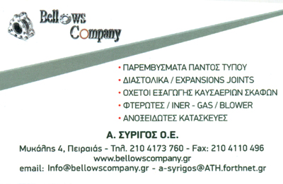 customer tabsΕπικοινωνίαΗ ‘Bellows Company’ εξειδικεύεται στην κατασκευή παντός τύπουπαρεμβυσμάτων και μεταλλοπλαστικών.Με την πολυετή πείρα της, έχει καταφέρει να θεμελιώσει μακροχρόνιεςσυνεργασίες με τις μεγαλύτερες εταιρείες στη Ελλάδα, κερδίζονταςέτσι καθημερινά την εμπιστοσύνη των ναυτιλιακών καιεμπορικών εταιρειών, καθώς και των βιομηχανιών.Η εταιρεία εξελίσσεται συνεχώς, παρέχοντας υψηλής ποιότητας προϊόντασε ανταγωνιστικές τιμές, με απώτερη επιδίωξη την άμεση ικανοποίηση των αναγκών των πελατών μας.Αναλαμβάνουμε την κατασκευή παντός τύπου στεγανωτικών φλαντζών,παρεμβυσμάτων όλων των ειδών από περμανίτη άνευ αμιάντου,μεταλοπλαστικών ενώσεων κεφαλής & οχετών εξαγωγής καυσαερίων.Όλες οι κατασκευές πραγματοποιούνται από το άρτια εκπαιδευμένοκαι καταρτισμένο προσωπικό μας, με την χρήση μηχανολογικού εξοπλισμούτελευταίας τεχνολογίας, διασφαλίζοντας έτσι την ποιότητα των παρεχόμενων προϊόντων μας.Μηχανουργεία και ΗλεκτρομηχανουργείαΑνοξείδωτες ΚατασκευέςΥπηρεσίεςΔόμηση - ΚατοικίαΜυκάλης 4, Καμίνια - ΠειραιάςΠΕΙΡΑΙΑΣ ΑΤΤΙΚΗΣΑΤΤΙΚΗΣΤΕΡΕΑ ΕΛΛΑΔΑ 2104173760 6971897415info@bellowscompany.grwww.bellowscompany.gr Το προτείνω (έχει προταθεί 2 φορές) ΦωτογραφίεςFacebook LikeShare on FacebookTweet Widget