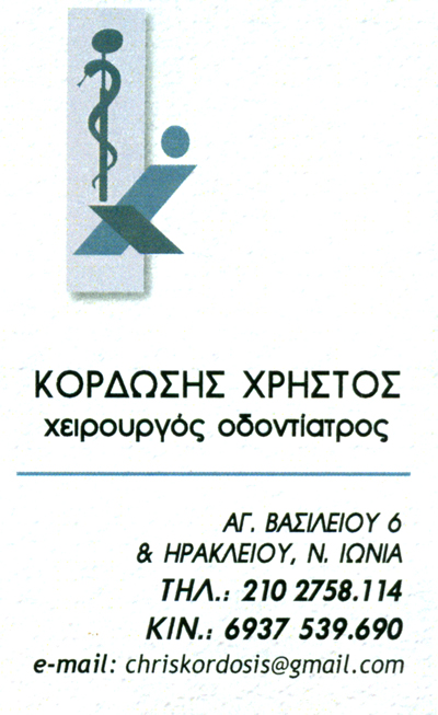 customer tabsΕπικοινωνίαΧειρουργοί ΟδοντίατροιΥγείαΑγίου Βασιλείου 6, Νέα ΙωνίαΝΕΑ ΙΩΝΙΑ ΑΤΤΙΚΗΣΑΤΤΙΚΗΣΤΕΡΕΑ ΕΛΛΑΔΑ 2102758114 6937539690chriskordosis@gmail.com Το προτείνω (έχει προταθεί 2 φορές) ΦωτογραφίεςFacebook LikeShare on FacebookTweet Widget