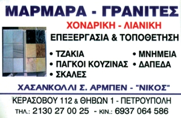customer tabsΕπικοινωνίαΗ πολυετής εμπειρία στον χώρο του εμπορίου και επεξεργασίας μαρμάρων, η ποιότητα εργασίας,η καλή εξυπηρέτηση στους πελάτες μας και οι ανταγωνιστικές μας τιμές, είναι μερικοί απότους λόγους για τους οποίους οι πελάτες μας, μας προτιμούν μας προτείνουν και διατηρούν τη συνεργασία τους μαζί μας.Είμαστε μαρμαράδες με τεχνογνωσία και αγάπη επάνω στην επεξεργασίακαι τοποθέτιση μαρμάρων και το εξιδικευμένο προσωπικό μας εξυπηρετείάμεσα στην Πετρούπολη,στο Περιστέρι, στο Ιλιον, στο Αιγάλεω, στο Καματερόσε όλα τα δυτικά προάστια στην Αθήνα και σε όλη την Αττική.Προτείνουμε την ιδανική επιλογή υλικού σύμφωνα με τις προδιαγραφές του έργου σας.Η δυναμική πορεία της επιχείρισή μας, βασίζεται στη συνεχή έρευνα νέων υλικώνκαι στον τεχνολογικό εξοπλισμό που διαθέτουμε για την επεξεργασία μαρμάρων και μαρμαρικών κατασκευών.Οι Υπηρεσίες μας:Εμπόριο μαρμάρων και επεξεργασία μαρμάρωνΜαρμαρικές κατασκευές και εργασίες λούστραΤρίψιμο μαρμάρων χωρίς σκόνες και ζημιέςΤοποθετήσεις μαρμάρωνΚατασκευές μνημείων (τάφων)Στρώσεις δαπέδωνΔάπεδα με σκληρά και ανθεκτικά μάρμαρα σε όλους τους χρωματισμούς Τζάκια, επενδύσεις σκάλας πλατύσκαλα , επενδύσεις μπάνιων, εσωτερικών και εξωτερικών χώρων, πάγκους λουτρού και κουζίνας.Μαρμαροψηφίδες, μάρμαρα, γρανίτες.Μάρμαρα ιδανικά για δάπεδα και ορθομαρμαρώσεις και μαρμαροποδιές. ΜάρμαραΓρανίτεςΚατασκευή ΜνημείωνΤζάκιαΔόμηση - ΚατοικίαΚερασόβου 112, ΠετρούποληΠΕΤΡΟΥΠΟΛΗ ΑΤΤΙΚΗΣΑΤΤΙΚΗΣΤΕΡΕΑ ΕΛΛΑΔΑ 2130270025 6937064586arbenhasankolli@gmail.com Το προτείνω (έχει προταθεί 0 φορές) ΦωτογραφίεςFacebook LikeShare on FacebookTweet Widget