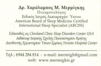 customer tabsΕπικοινωνίαΕιδικός Ιατρός Ύπνου (American Board Certified International Sleep Specialist)Πνευμονολόγοι - ΦυματιολόγοιΥγείαΠίνδου & Θράκης 61Α, ΒριλήσσιαΒΡΙΛΗΣΣΙΑ ΑΤΤΙΚΗΣΑΤΤΙΚΗΣΤΕΡΕΑ ΕΛΛΑΔΑ 2106972884 6944284814c.mermigkis@dunant.grmermigh@gmail.comwww.mermigkis.grDr. Μερμίγκης Χαράλαμπος Το προτείνω (έχει προταθεί 0 φορές) ΦωτογραφίεςFacebook LikeShare on FacebookTweet Widget