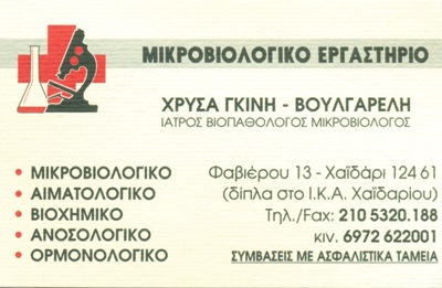 customer tabsΕπικοινωνίαΑιματολογικές, βιοχημικές, ορμονολογικές, ανοσολογικές εξετάσεις, προγεννητικός έλεγχος, έλεγχος γονιμότητας, καρκινικοί δείκτες, Τεστ, αιμοληψιές κατ΄οίκον με ραντεβού.Καθημερινά 07:30 - 14:00.Μικροβιολόγοι - ΒιοπαθολόγοιΥγείαΦαβιέρου 13, ΧαϊδάριΧΑΪΔΑΡΙ ΑΤΤΙΚΗΣΑΤΤΙΚΗΣΤΕΡΕΑ ΕΛΛΑΔΑ 2105320188 6972622001gkini@mail.com Το προτείνω (έχει προταθεί 0 φορές) ΦωτογραφίεςFacebook LikeShare on FacebookTweet Widget