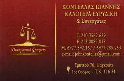 customer tabsΕπικοινωνίαΤο δικηγορικό μας γραφείο στο κέντρο της Αθήνας, αναλαμβάνειμε πλήρη επαγγελματισμό την επίλυση των υποθέσεων σας.Διαθέτουμε εμπείρους και εξειδικευμένους συνεργάτες στο γραφείομας στο Παγκράτι και είμαστε πάντα σε θέση να συζητήσουμε τα θέματα που σας αφορούν. Το δικηγορικό γραφείο ειδικεύεται στα: παροχή όλων τωννομικών υποθέσεων, νόμο Κατσέλη, οικογενειακό δίκαιο, ιατρικά λάθη,εξειδίκευση σε αυτοκίνητα, υπερχρεωμένα νοικοκυριά, κόκκινα δάνεια.Οικογενειακές ΔιαφορέςΑυτοκινητιστικές Διαφορές - Τροχαία ΑτυχήματαΜισθώσειςΑκίνηταΚληρονομικές ΔιαφορέςΕμπράγματες ΔιαφορέςΕνοχικές ΔιαφορέςΣυμβάσεις ΈργουΔικηγόροι και Δικηγορικά ΓραφείαΥπηρεσίεςΥμηττού 76, Παγκράτι - ΑθήναΠΑΓΚΡΑΤΙ ΑΤΤΙΚΗΣΑΤΤΙΚΗΣΤΕΡΕΑ ΕΛΛΑΔΑ 2107562639 6977392167johnkontellas@gmail.comwww.kontellasdikigorosathina.gr Το προτείνω (έχει προταθεί 2 φορές) ΦωτογραφίεςFacebook LikeShare on FacebookTweet Widget
