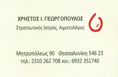 customer tabsΕπικοινωνίαΔέχεται καθημερινά με ραντεβού.ΑιματολόγοιΥγείαΜητροπόλεως 90, ΘεσσαλονίκηΘΕΣΣΑΛΟΝΙΚΗ ΘΕΣΣΑΛΟΝΙΚΗΣΘΕΣΣΑΛΟΝΙΚΗΜΑΚΕΔΟΝΙΑ 2310262708 6932351740ch.georgo64@gmail.com Το προτείνω (έχει προταθεί 0 φορές) ΦωτογραφίεςFacebook LikeShare on FacebookTweet Widget