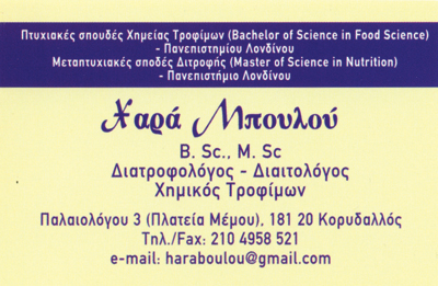 customer tabsΕπικοινωνίαΓια κάθε άτομο λαμβάνεται ιστορικό που αφορά διατροφικές συνήθειες και προτιμήσεις, την κατάσταση της υγείας και τον τρόπο ζωής του. Τα προγράμματα διατροφής είναι εξατομικευμένα και επιστημονικά σχεδιασμένα, βασισμένα σε υγιεινά διατροφικά πρότυπα και συμβαδίζουν στον σύγχρονο τρόπο ζωής και της ανάγκες του κάθε ατόμου.Τα προγράμματα είναι υπολογισμένα βασισμένα στα παρακάτω:1. Ηλικία2. Βάρος3. Ύψος4. Φυσική δραστηριότητα5. Φύλο6. Προβλήματα υγείας (αν υπάρχουν)7. Καθημερινές συνήθειες8. Ωράριο δουλειάς9. Διατροφικές προτιμήσειςΣτο ραντεβού εκτός από το ζύγισμα γίνεται και λιπομέτρηση και υπολογισμός μεταβολισμού Η λιπομέτρηση γίνεται με συσκευή ανάλυσης βιο-ηλετρικής εμπέδησης. Υπολογίζεται με ακρίβεια η λιπώδης, η άλιπη και η μυϊκή μάζα και τα συνολικά υγρά του σώματος σε ποσοστιαίες μονάδες και κιλά.Η συχνότητα των συνεδριών μπορεί να είναι εβδομαδιαία, δεκαπενθήμερη ή μηνιαία ανάλογα με της ανάγκες σας. Στο κάθε ραντεβού συζητάμε το αποτέλεσμα, το τι σας άρεσε και το τι δεν σας άρεσε, τι σας έχει λείψει και τι έχετε βαρεθεί. Με βάση αυτά που θα συζητηθούν διαμορφώνεται ένα καινούργιο πρόγραμμα κάθε φορά.Διαιτολόγοι - ΔιατροφολόγοιΥγείαΚωνσταντίνου Παλαιολόγου 3, ΚορυδαλλόςΚΟΡΥΔΑΛΛΟΣ ΑΤΤΙΚΗΣΑΤΤΙΚΗΣΤΕΡΕΑ ΕΛΛΑΔΑ 2104958521 6973086751haraboulou@gmail.comwww.haraboulou.grΔιαιτολόγος Διατροφολόγος Χαρά Μπουλού Το προτείνω (έχει προταθεί 0 φορές) ΦωτογραφίεςFacebook LikeShare on FacebookTweet Widget