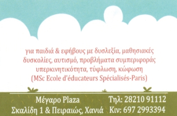 customer tabsΕπικοινωνίαΔέχεται καθημερινά κατόπιν ραντεβού.Προετοιμασία για δημοτικό, μελέτη παιδιών, δημοτικού και γυμνασίου.Παιχνιδοθεραπεία για τόνωση της μαθηματικής, λογικής σκέψης και της αυτοπεποίθησης.Καθηγητές - ΠαιδαγωγοίΛογοπεδικοί - ΛογοθεραπευτέςΕκπαίδευσηΥγείαΣκαλίδη & Πειραιώς 1, 1ος όροφος, ΧανιάΧΑΝΙΑ ΧΑΝΙΩΝΧΑΝΙΑΚΡΗΤΗ 2821091112 6972993394 Το προτείνω (έχει προταθεί 0 φορές) ΦωτογραφίεςFacebook LikeShare on FacebookTweet Widget