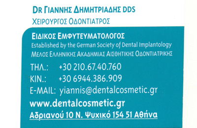 customer tabsΕπικοινωνίαΑισθητική ΟδοντιατρικήΠροσθετική ΟδοντιατρικήΕμφυτεύματαClear AlignerΟζονοθεραπείαΑισθητική ΟδοντιατρικήΥγείαΑνδριανού 10, Νέο ΨυχικόΨΥΧΙΚΟ ΑΤΤΙΚΗΣΑΤΤΙΚΗΣΤΕΡΕΑ ΕΛΛΑΔΑ 2106740760 6944386909info@dentalcosmetic.grwww.dentalcosmetic.grDental Cosmetic Dr Γιάννης Δημητριάδης Χειρουργός Οδοντίατρος Το προτείνω (έχει προταθεί 0 φορές) ΦωτογραφίεςFacebook LikeShare on FacebookTweet Widget