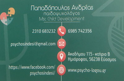 O Ανδρέας Παπαδόπουλος MSc, Ψυχολόγος Παιδοψυχολόγος, είναι υπεύθυνος του Κέντρου Ειδικών Θεραπειών«ΨΥΧΟΣΥΝΔΕΣΗ - ΠΑΠΑΔΟΠΟΥΛΟΣ ΑΝΔΡΕΑΣ MSc» στην περιοχή Εύοσμος της Θεσσαλονίκης και προσφέρει την δυνατότητα συνεδριών μέσω Skype σε όλη την Ελλάδα αλλά και το εξωτερικό.