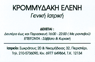 customer tabsΕπικοινωνίαΓενική ΙατρικήΥγείαΣωκράτους 20 & Νικομηδείας, ΠεριστέριΠΕΡΙΣΤΕΡΙ ΑΤΤΙΚΗΣΑΤΤΙΚΗΣΤΕΡΕΑ ΕΛΛΑΔΑ 2105736090 6977649864elenidaki@hotmail.com Το προτείνω (έχει προταθεί 1 φορές) ΦωτογραφίεςFacebook LikeShare on FacebookTweet Widget