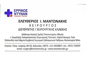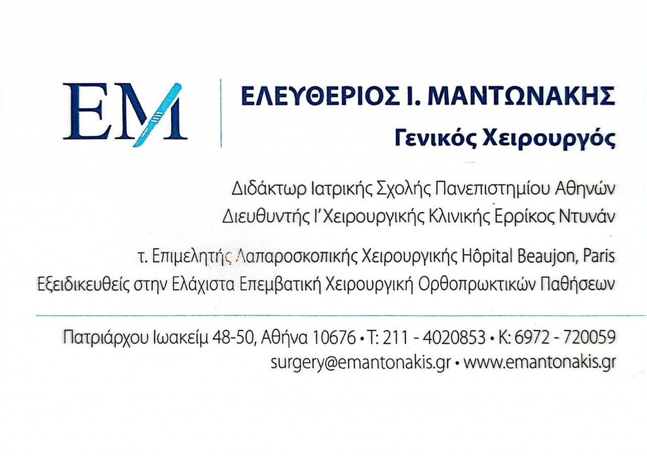 customer tabsΕπικοινωνίαΛαπαροσκοπική χολοκυστεκτομήΛαπαροσκοπική αποκατάσταση κηλών (βουβωνοκήλη, μηροκήλη, ομφαλοκήλη)Λαπαροσκοπική σκωληκοειδεκτομήΑντιμετώπιση αιμορροΐδωνΑντιμετώπιση περιεδρικών συρριγίων-αποστημάτωνΚύστη ΚόκκυγοςΕπεμβάσεις Λεπτού & Παχέος ΕντέρουΟ Ελευθέριος Μαντωνάκης αποφοίτησε από την Ιατρική Σχολή του Πανεπιστημίου Αθηνών και ειδικεύτηκε στη Γενική Χειρουργική στην Α’ Χειρουργική Κλινική του Πανεπιστημίου Αθηνών. Μετεκπαιδεύτηκε στη Λαπαροσκοπική Χειρουργική του Πεπτικού και της Παχυσαρκίας στα Πανεπιστημιακά Νοσοκομεία Beaujon και Georges-Pompidou στο Παρίσι. Δέχεται κατόπιν ραντεβού στην οδό Πατριάρχου Ιωακείμ 48-50 στο Κολωνάκι και χειρουργεί στο Ερρίκος Ντυνάν Hospital Center. Ο Χειρουργός και το Νοσοκομείο ακολουθούν όλα τα διεθνή πρότυπα και διαδικασίες σχετικά με την αντιμετώπιση των παθήσεων και την ασφάλεια του ασθενούς. Γενικοί ΧειρουργοίΥγείαΠατριάρχου Ιωακείμ 48-50, Κολωνάκι, ΑθήναΑΘΗΝΑ ΑΤΤΙΚΗΣΑΤΤΙΚΗΣΤΕΡΕΑ ΕΛΛΑΔΑ 2114020853surgery@emantonakis.grwww.emantonakis.grΕλευθέριος Μαντωνάκης - Χειρουργός Το προτείνω (έχει προταθεί 1 φορές) ΦωτογραφίεςFacebook LikeShare on FacebookTweet Widget