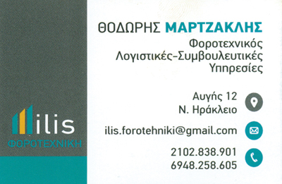 customer tabsΕπικοινωνίαΟργάνωση Επιχειρήσεων, Τήρηση ΒιβλίωνΕργατικά, ΜισθοδοσίαΣυμβουλευτικές Φορολογικές ΥπηρεσίεςΔηλώσεις Εισοδήματος, Ε9Σύσταση εταιρειών Α.Ε.Ρυθμίσεις οφειλώνΙσολογισμοίΤήρηση βιβλίωνΛογιστικές- Φοροτεχνικές ΥπηρεσίεςΥπηρεσίεςΑυγής 12, Νέο ΗράκλειοΗΡΑΚΛΕΙΟ ΑΤΤΙΚΗΣΑΤΤΙΚΗΣΤΕΡΕΑ ΕΛΛΑΔΑ 2102838901 6948258605ilis.forotehniki@gmail.com Το προτείνω (έχει προταθεί 0 φορές) ΦωτογραφίεςFacebook LikeShare on FacebookTweet Widget