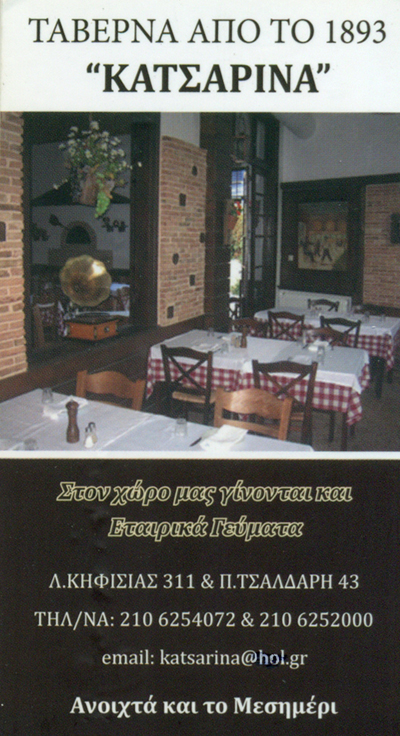 customer tabsΕπικοινωνίαΕστιατόρια και ΤαβέρνεςΔιασκέδαση - ΕστίασηΤουρισμόςΛ. Κηφισίας 311 & Π.Τσαλδάρη 43, ΚηφισιάΚΗΦΙΣΙΑ ΑΤΤΙΚΗΣΑΤΤΙΚΗΣΤΕΡΕΑ ΕΛΛΑΔΑ 2106254072 6977261615info@katsarina.grwww.katsarina.grΚατσαρίνα Το προτείνω (έχει προταθεί 1 φορές) ΦωτογραφίεςFacebook LikeShare on FacebookTweet Widget
