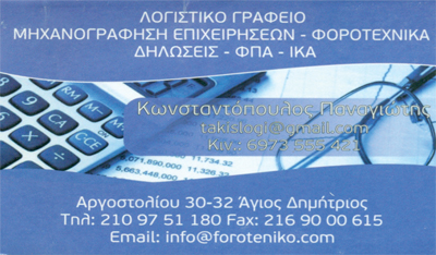 customer tabsΕπικοινωνίαΛογιστικές- Φοροτεχνικές ΥπηρεσίεςΥπηρεσίεςΑργοστολίου 30-32, Αγ. ΔημήτριοςΑΓΙΟΣ ΔΗΜΗΤΡΙΟΣ ΑΤΤΙΚΗΣΑΤΤΙΚΗΣΤΕΡΕΑ ΕΛΛΑΔΑ 2109751180 6973555421takislogi@gmail.com Το προτείνω (έχει προταθεί 1 φορές) ΦωτογραφίεςFacebook LikeShare on FacebookTweet Widget