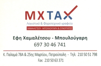 customer tabsΕπικοινωνίαΛογιστικές- Φοροτεχνικές ΥπηρεσίεςΥπηρεσίεςΚωστή Παλαμά 78α & 25ης ΜαρτίουΠΕΤΡΟΥΠΟΛΗ ΑΤΤΙΚΗΣΑΤΤΙΚΗΣΤΕΡΕΑ ΕΛΛΑΔΑ 2105055798 6973046741info@mxtax.grhttp://mxtax.gr/ Το προτείνω (έχει προταθεί 1 φορές) ΦωτογραφίεςFacebook LikeShare on FacebookTweet Widget