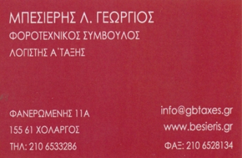 customer tabsΕπικοινωνίαΦορολογικές δηλώσειςΕνφιαΥποβολή ΑΠΔΡύθμιση οφειλώνΤήρηση βιβλίωνΑπόδοση Φ.Π.Α.Το Λογιστικό Φοροτεχνικό Γραφείο ΜΠΕΣΙΕΡΗΣ ΓΕΩΡΓΙΟΣ & ΣΥΝΕΡΓΑΤΕΣ είναι μια επιχείρηση που δραστηριοποιείται στην παροχή Λογιστικών Φοροτεχνικών υπηρεσιών από το 1987.Με έμπειρο επιστημονικό προσωπικό οποίο συνεχώς επιμορφώνεται προκειμένου να μπορεί να ανταπεξέλθει τις αυξημένες απαιτήσεις των Φορολογικών θεμάτων Με σύγχρονες κτιριακές εγκαταστάσεις και μηχανολογικό εξοπλισμό αιχμής το γραφειο πρωτοστατεί στην προσπάθεια των επιχειρήσεων για εκπλήρωση των σχεδιασμένων πρωτοβουλιών .Το στελεχικό δυναμικό της εταιρείας απαρτίζεται από εξειδικευμένο επιστημονικό προσωπικό Λογιστών Α & Β Τάξης πτυχιούχων ανωτάτων σχολών με πολυετή εμπειρία και γνώση σε όλο το φάσμα των Λογιστικών Φορολογικών Υπηρεσιών.Με βάση την εμπειρία και την γνώση μας έχουμε δημιουργήσει δυο γενικές υπηρεσίες προς Ιδιώτες και προς Επιχειρήσεις. Βασιζομένη στην υψηλή ποιότητα Λογιστικών Φορολογικών Υπηρεσιών ο στόχος μας είναι η αποφυγή κατά το δυνατόν και στα πλαίσια των ελληνικών νόμων της υπέρμετρης φορολόγησης και στην εξεύρεσή αξιόπιστων λύσεων.Η επιτυχία της συνεργασίας μας βασίζεται στην πολυετή πείρα μας στην συνέπεια στην αξιοπιστία και στην εχεμύθεια μας. Λογιστικές- Φοροτεχνικές ΥπηρεσίεςΥπηρεσίεςΦανερωμένης 11Α, ΧολαργόςΧΟΛΑΡΓΟΣ ΑΤΤΙΚΗΣΑΤΤΙΚΗΣΤΕΡΕΑ ΕΛΛΑΔΑ 21065332862106528134info@gbtaxes.grwww.besieris.gr Το προτείνω (έχει προταθεί 0 φορές) ΦωτογραφίεςFacebook LikeShare on FacebookTweet Widget
