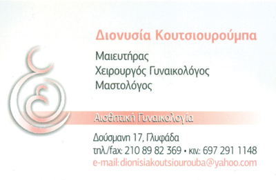 customer tabsΕπικοινωνίαΣυνεργάζεται με γυναικολογικές κλινικές: ΡΕΑ & ΙΑΣΩΜαιευτήρες - ΓυναικολόγοιΥγείαΔούσμανη 17ΓΛΥΦΑΔΑ ΑΤΤΙΚΗΣΑΤΤΙΚΗΣΤΕΡΕΑ ΕΛΛΑΔΑ 2108982369 6972911148dionisiatsiourouba@yahoo.com Το προτείνω (έχει προταθεί 1 φορές) ΦωτογραφίεςFacebook LikeShare on FacebookTweet Widget