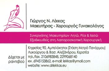 customer tabsΕπικοινωνίαΜαιευτήρας - Χειρουργός Γυναικολόγος Μέλος του Ιατρικού Συλλόγου Αθηνών- Μέλος του Ιατρικού Συλλόγου Μεγάλης Βρετανίας GMC- Μέλος της Παγκόσμιας Εταιρείας Χειρουργών Λαπαροσκόπων WALS2η Δ/νση: Λυκούργου & Βασ.Αλεξάνδρου, ΚερατέαΩράριο:Δευτέρα & Τετάρτη 17.00 - 20.00 (Αθήνα) Τρίτη & Πέμπτη, 17.00 -20.00 ΚερατέαΜαιευτήρες - ΓυναικολόγοιΥγείαΛεωφ. Κηφισίας 90Λυκούργου & Βασ.Αλεξάνδρου, Κερατέα(2299068140)ΑΜΠΕΛΟΚΗΠΟΙ ΑΤΤΙΚΗΣΑΤΤΙΚΗΣΤΕΡΕΑ ΕΛΛΑΔΑΚΕΡΑΤΕΑ ΑΝΑΤΟΛΙΚΗΣ ΑΤΤΙΚΗΣ 2106983848(ΑΘΗΝΑ) 6945153862lekkas@ymail.comwww.drlekkas.gr Το προτείνω (έχει προταθεί 1 φορές) ΦωτογραφίεςFacebook LikeShare on FacebookTweet Widget