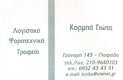 customer tabsΕπικοινωνίαΛογιστικές- Φοροτεχνικές ΥπηρεσίεςΥπηρεσίεςΔημ. Γούναρη 145, ΓλυφάδαΓΛΥΦΑΔΑ ΑΤΤΙΚΗΣΑΤΤΙΚΗΣΤΕΡΕΑ ΕΛΛΑΔΑ 2109640130 6932434351korba@otenet.grΛογιστικό Γραφείο Κορμπά Γιώτα & Συνεργάτες Το προτείνω (έχει προταθεί 4 φορές) ΦωτογραφίεςFacebook LikeShare on FacebookTweet Widget