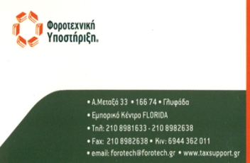customer tabsΕπικοινωνίαΛογιστικές- Φοροτεχνικές ΥπηρεσίεςΥπηρεσίεςΛεωφ. Δημάρχου Αγγέλου Μεταξά 33, Εμπορικό Κέντρο Florida, 2ος όροφος, Γραφείο Β8, ΓλυφάδαΓΛΥΦΑΔΑ ΑΤΤΙΚΗΣΑΤΤΙΚΗΣΤΕΡΕΑ ΕΛΛΑΔΑ 2108981633 6944362011nikosd@taxsupport.grinfo@taxsupport.grwww.taxsupport.gr Το προτείνω (έχει προταθεί 1 φορές) ΦωτογραφίεςFacebook LikeShare on FacebookTweet Widget