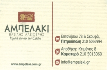 customer tabsΕπικοινωνίαΤο «Αμπελάκι» δραστηριοποιείται στον χώρο του ποιοτικού κρασιού από το 2000. Εδρεύει στην Πετρούπολη Αττικής σε ιδιόκτητες εγκαταστάσεις που ξεπερνούν τα 1000τ.μ.και διαθέτει κατάστημα λιανικής πώλησης στην οδό Επτανήσου 78.Η εταιρεία ιδρύθηκε με πολύ μεράκι και αγάπη για τα κρασιά από τον Βασίλη Αλειφέρη.Το «Αμπελάκι» διήνυσε πολύ δρόμο και η εξέλιξη της πορείας του αντικατοπτρίζει τιςαλλαγές που έλαβαν χώρα στην παραγωγή οίνου στην Ελλάδα.Η εταιρεία έχει εξασφαλίσει τη συνεργασία με επιλεγμένα οινοποιεία και τους καλύτερουςπαραγωγούς από όλη την Ελλάδα, καλύπτοντας έτσι ένα μεγάλο φάσμα των απαιτήσεων του σύγχρονου καταναλωτή.Εδώ και αρκετά χρόνια αντιπροσωπεύει, μεταξύ άλλων, και τα φημισμένα κρασιά ΖΙΤΣΑΣ ΒΟΡΟΙΝΟΣτης ΖΟΙΝΟΣ Α.Ε., τον Οινοποιητικό Συνεταιρισμό Τυρνάβου, το Οινοποιείο Βαένι Νάουσσας,το Οινοποιείο Αμαργιωτάκη απο την Κρήτη, το κτήμα Μπίζιος απο τη νεμέα, το ΟινοποείοΚαραμήτρος Μεσενικόλα απο την καρδίτσα κ.α.Είδη ΟινοποιίαςΟινοπνευματοποιία - Οινοποιία - Ποτοποιία - ΖυθοποιίαΛοιπάΕπτανήσου 78 & Σκουφά, ΠετρούποληΚτιμένης 8, ΚαματερόΠΕΤΡΟΥΠΟΛΗ ΑΤΤΙΚΗΣΚΑΜΑΤΕΡΟ ΑΤΤΙΚΗΣΑΤΤΙΚΗΣΤΕΡΕΑ ΕΛΛΑΔΑ 2105066994 2105013060 6972774524info@ampelaki.com.grwww.ampelaki.com.gr Το προτείνω (έχει προταθεί 0 φορές) ΦωτογραφίεςFacebook LikeShare on FacebookTweet Widget