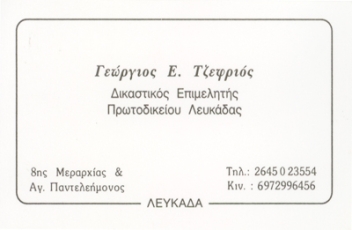customer tabsΕπικοινωνίαΔικαστικοί ΕπιμελητέςΥπηρεσίες8ης Μεραρχίας (Κτίριο ΔΕΗ), ΛευκάδαΛΕΥΚΑΔΑΝΗΣΙΑ ΙΟΝΙΟΥ ΠΕΛΑΓΟΥΣ 2645026523 2645024640 6972996456 6976109849d.e.tzefrios@gmail.com Το προτείνω (έχει προταθεί 0 φορές) ΦωτογραφίεςFacebook LikeShare on FacebookTweet Widget
