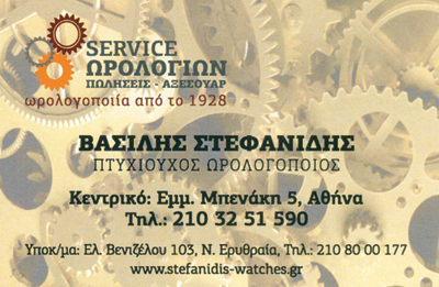 customer tabsΕπικοινωνίαΡολόγιαΑνδρικάΓυναικείαΠαιδικάVintage ΡολόγιαΞυπνητήριαΚόσμημαΓάμος-ΒάπτισηΒέρεςΣταυροίΒραχιόλιαΔαχτυλίδιαΚολιέΜανικετόκουμπαΛουράκιαΑξεσουάρService ΩρολογίωνService ΚοσμημάτωνΕξαρτήματα ΡολογιώνΕπισκευές ΡολογιώνΚοσμήματαΛοιπάΥπηρεσίεςΜπενάκη Εμμανουήλ 5, ΑθήναΕλευθερίου Βενιζέλου 103, Νέα ΕρυθραίαΑΘΗΝΑ ΑΤΤΙΚΗΣΝΕΑ ΕΡΥΘΡΑΙΑ ΑΤΤΙΚΗΣΑΤΤΙΚΗΣΤΕΡΕΑ ΕΛΛΑΔΑ 2103251590 2108000177 6987269211info@stefanidis-watches.grstefanidis-watches.grstefanidiswatchandjewellery Το προτείνω (έχει προταθεί 0 φορές) ΦωτογραφίεςFacebook LikeShare on FacebookTweet Widget
