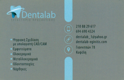 customer tabsΕπικοινωνίαΤο οδοντοτεχνικό εργαστήριο DENTALAB - Αιγινίτης Ιωάννης λειτουργεί στην Αθήνα από το 1980.Εδώ και 50 χρόνια στόχος μας παραμένει πάντοτε η παράδοση εργασιών υψηλής ποιότητας, στον σωστό χρόνο, για απόλυτα ευχαριστημένους πελάτες και ασθενείς.Όραμά μας είναι να γίνουμε ο συνεργάτης σας με την μεγαλύτερη αξία. Για να το πετύχουμε αυτό, εστιάζουμε στην απόλυτη ικανοποίηση των πελατών μας καθώς και των ασθενών τους, παρέχοντας σύγχρονες υπηρεσίες απαράμιλλης ποιότητας.Είμαστε έτοιμοι να αντιμετωπίσουμε κάθε πρόκληση και να γίνουμε ο πολύτιμος συνεργάτης σας.Οδοντοτεχνίτες και Οδοντοτεχνικά ΕργαστήριαΥγείαΓιαννιτσών 78 Κυψέλη, ΑθήναΑΘΗΝΑ ΑΤΤΙΚΗΣΑΤΤΙΚΗΣΤΕΡΕΑ ΕΛΛΑΔΑ 2108829617 6946904324dentalab_1@yahoo.grwww.dentalab-eginitis.comDentalab - Οδοντοτεχνικό Εργαστήριο - Dental Laboratory Το προτείνω (έχει προταθεί 0 φορές) ΦωτογραφίεςFacebook LikeShare on FacebookTweet Widget