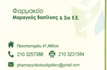 customer tabsΕπικοινωνίαΦαρμακείαΦαρμακευτικά Είδη και ΠροϊονταΥγείαΕλ. Βενιζέλου 41, Στοα Νικολούδη, ΑθήναΑΘΗΝΑ ΑΤΤΙΚΗΣΑΤΤΙΚΗΣΤΕΡΕΑ ΕΛΛΑΔΑ 2103257388pharmacynikoloudigallery@gmail.cominfo@maragkospharmacies.grwww.maragkospharmacies.grΦαρμακεία Μαραγκός Το προτείνω (έχει προταθεί 1 φορές) ΦωτογραφίεςFacebook LikeShare on FacebookTweet Widget