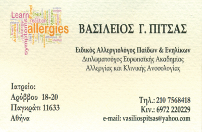 customer tabsΕπικοινωνίαΔιάγνωση αλλεργικών παθήσεων: αλλεργία σε τροφές, φάρμακα, τσιμπήματα από σφήκες, μέλισσες.Αλλεργία σε γύρεις φυτών,δέντρων, τρίχωμα ζώων, μύκητες, οικιακή σκόνη, άλευρα.Διενέργεια δερματικών δοκιμασιών επιδερικών, ενδοδερμικών, επικόλληση αλλεργιογόνων στη ράχη,Διενέργεια τροφικών, φαρμακευτικών, ρινικών και βρογχικών προκλήσεων.Έναρξη ανοσοθεραπείας σε σφήκα, μέλισσα καθώς και σε εισπνεόμενα αλλεργιογόνα.Διαχείριση χρονίας κνίδωσης και αγγειοοιδήματος.Το ιατρείο λειτουργεί κάθε Παρασκευή με προγραμματισμένα ραντεβού. 2ο ιατρείο: Αρύββου 18-20 ΠαγκράτιΤηλ. 2107568418 ΑλλεργιολόγοιΥγείαΒενιζέλου Ελευθερίου 12, ΑμαλιάδαΑρύββου 18-20, ΠαγκράτιΑΜΑΛΙΑΔΑ ΗΛΕΙΑΣΠΑΓΚΡΑΤΙ ΑΤΤΙΚΗΣΗΛΕΙΑΠΕΛΟΠΟΝΝΗΣΟΣΑΤΤΙΚΗΣΤΕΡΕΑ ΕΛΛΑΔΑ 2622020044 2107568418 6972220229vasiliospitsas@yahoo.com Το προτείνω (έχει προταθεί 0 φορές) ΦωτογραφίεςFacebook LikeShare on FacebookTweet Widget